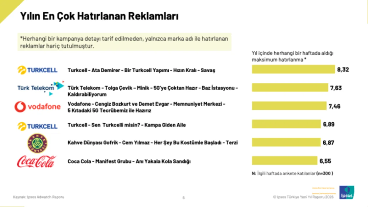 2025’te en çok hatırlanan reklamları analiz eden Ipsos, üç sektörün öne çıktığını belirledi: telekomünikasyon, gıda ve içecek. Turkcell, Türk Telekom ve Vodafone, ünlü isimlerin rol aldığı yüksek prodüksiyonlu reklamlarla listede ilk üç sırayı aldı.